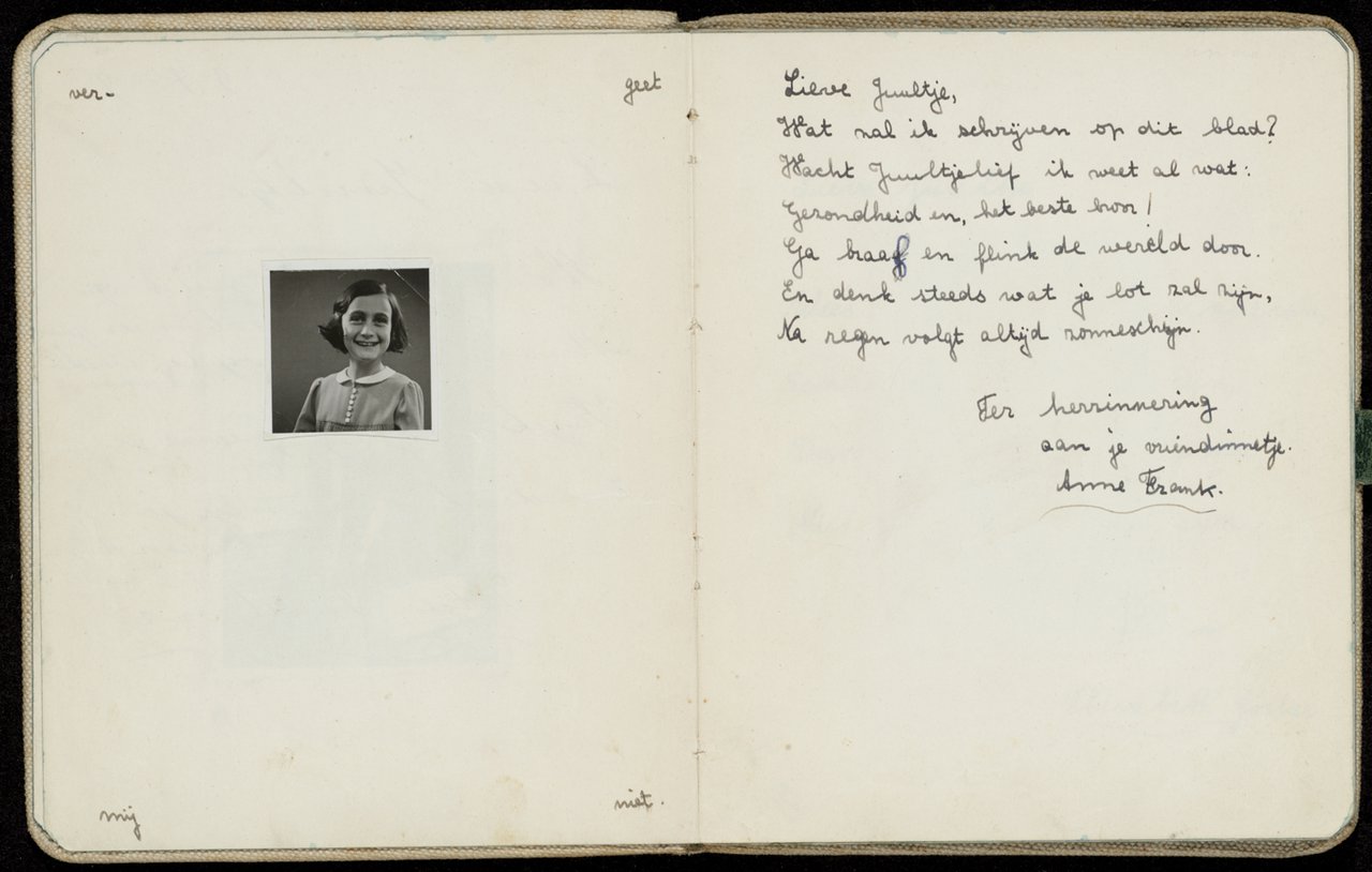 Anne’s own autograph book, which she writes about in her diary, was lost. The autograph books of two other classmates, Mary Bos and Bep van Groot-Battavé, also contain verses written by Anne. These autograph books have survived and are part of the Anne Frank House Collection.